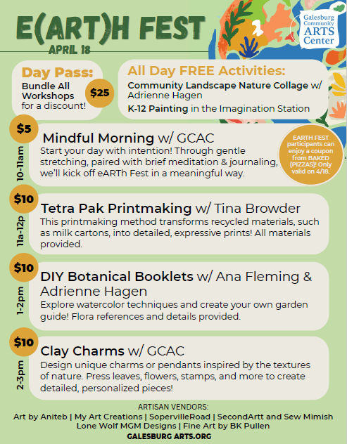 Submit your favorite Earth Day-inspired photo by 3pm on April 18th to be considered! All photos submitted before the 18th will be on display throughout Earth Fest! Digital submissions can be sent to education@galesburgarts.org, and in-person submissions can be dropped off during our open hours leading up to the event.